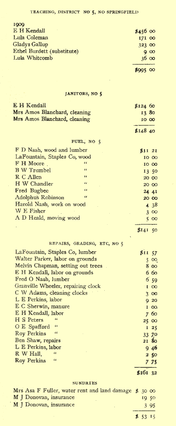 1907 -- North Springfield school facilities became an issue in the summer of 1907. A special town meeting was called on June 15th to consider building a one room addition to the existing building, and wound up with a second meeting June 29th appropriating $10,000 for a new brick school building. The committee appointed, comprised of the school directors and Messers. R. C. Allen and Edward H. Kendall, were unable to secure bids within this amount. The upshot of this was that a third special meeting, October 5th, authorized changes in numbers of rooms as well as from brick to frame, but the appropriation stood.